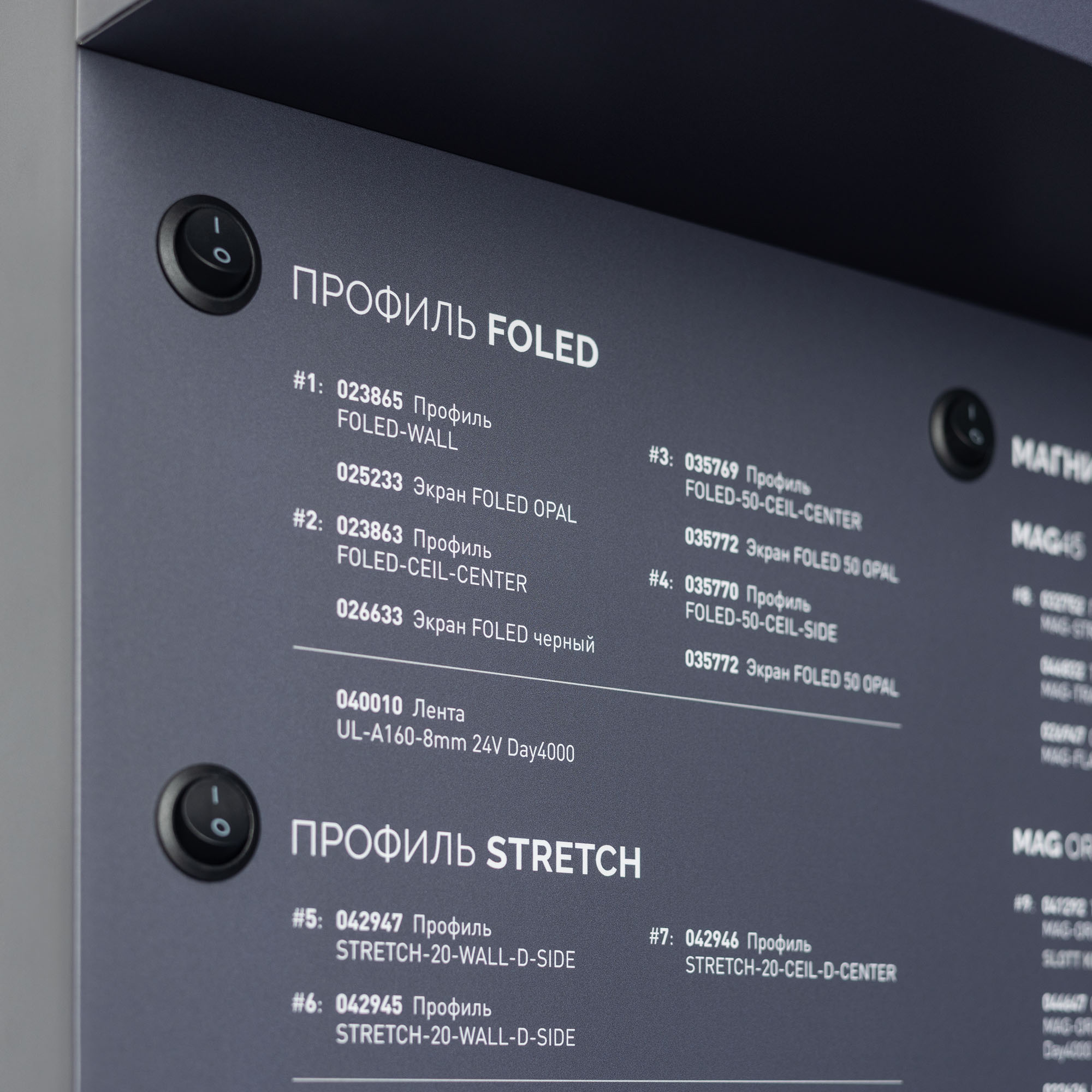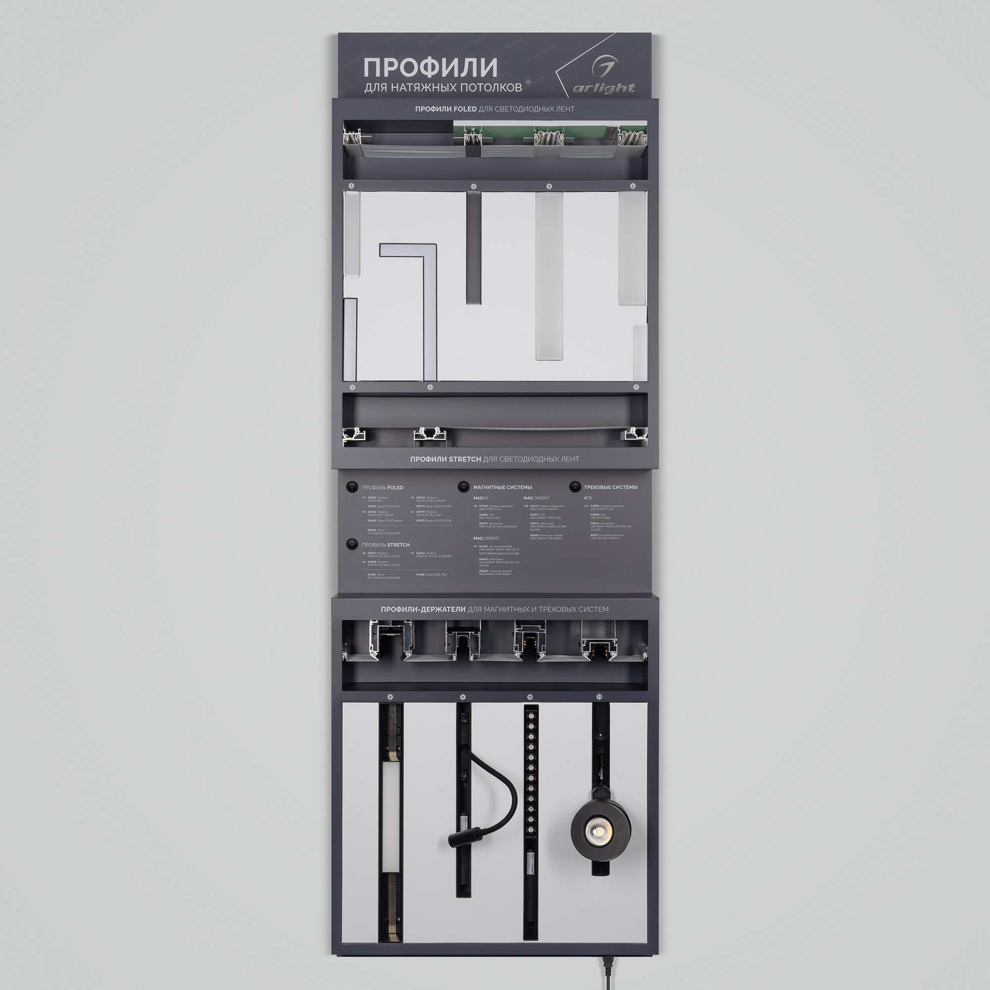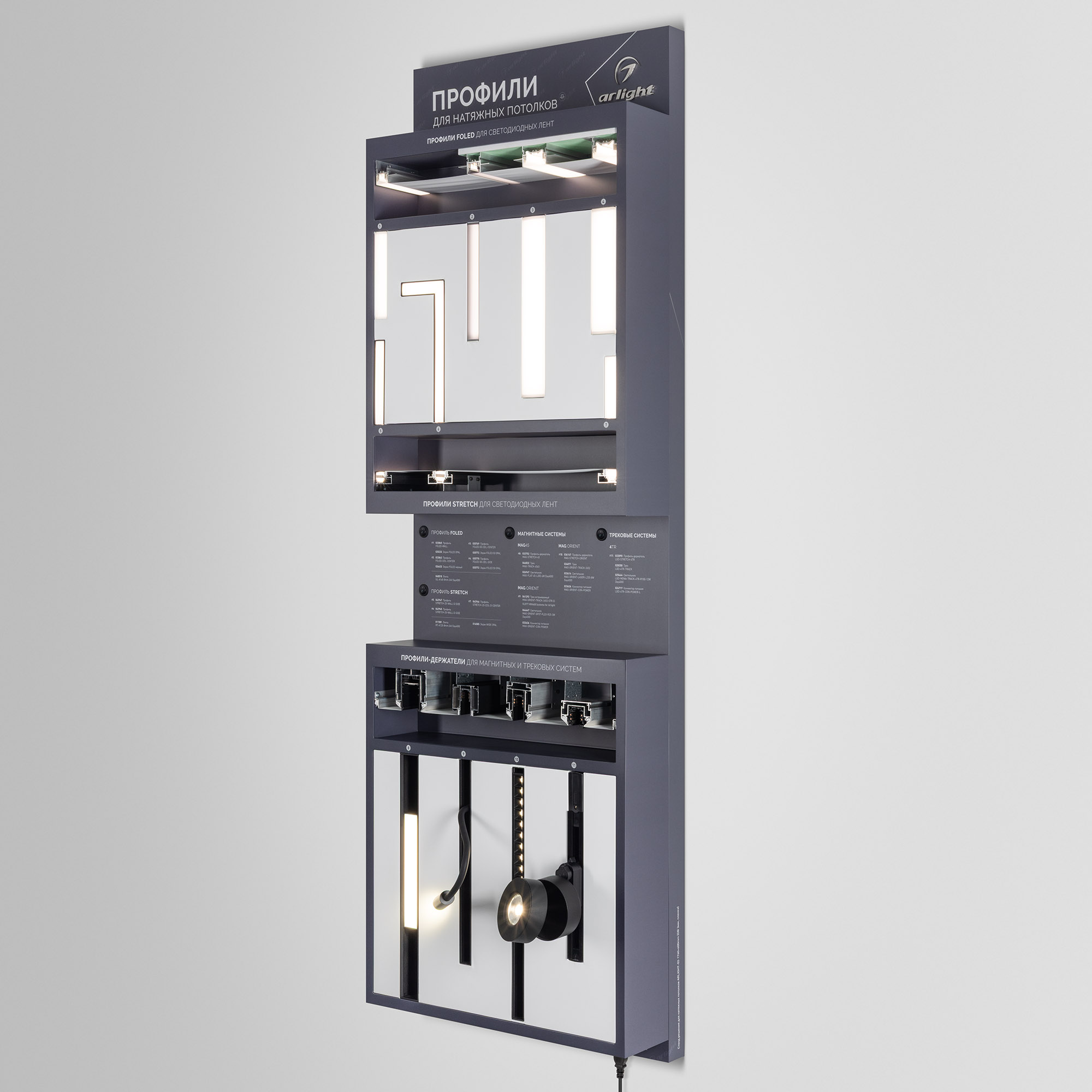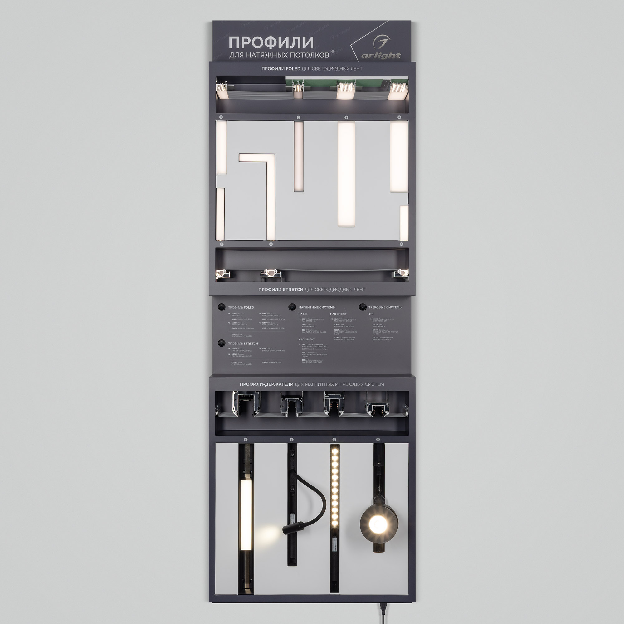 На стенде представлен ассортимент профилей Arlight для натяжных потолков: Профиль серии FOLED, совмещающий в своей конструкции каркас для крепления натяжного потолка из ПВХ, гипсокартона и профиль для установки светодиодной ленты. Серия STRETCH с шириной световой линии 22 мм подходит для создания центральной и боковой линии света в натяжных потолках из ткани и ПВХ. Профиль-держатель MAG STRETCH для установки магнитных треков в натяжной потолок. Материал корпуса стенда - алюкобонд 3 мм, пленка, печать.