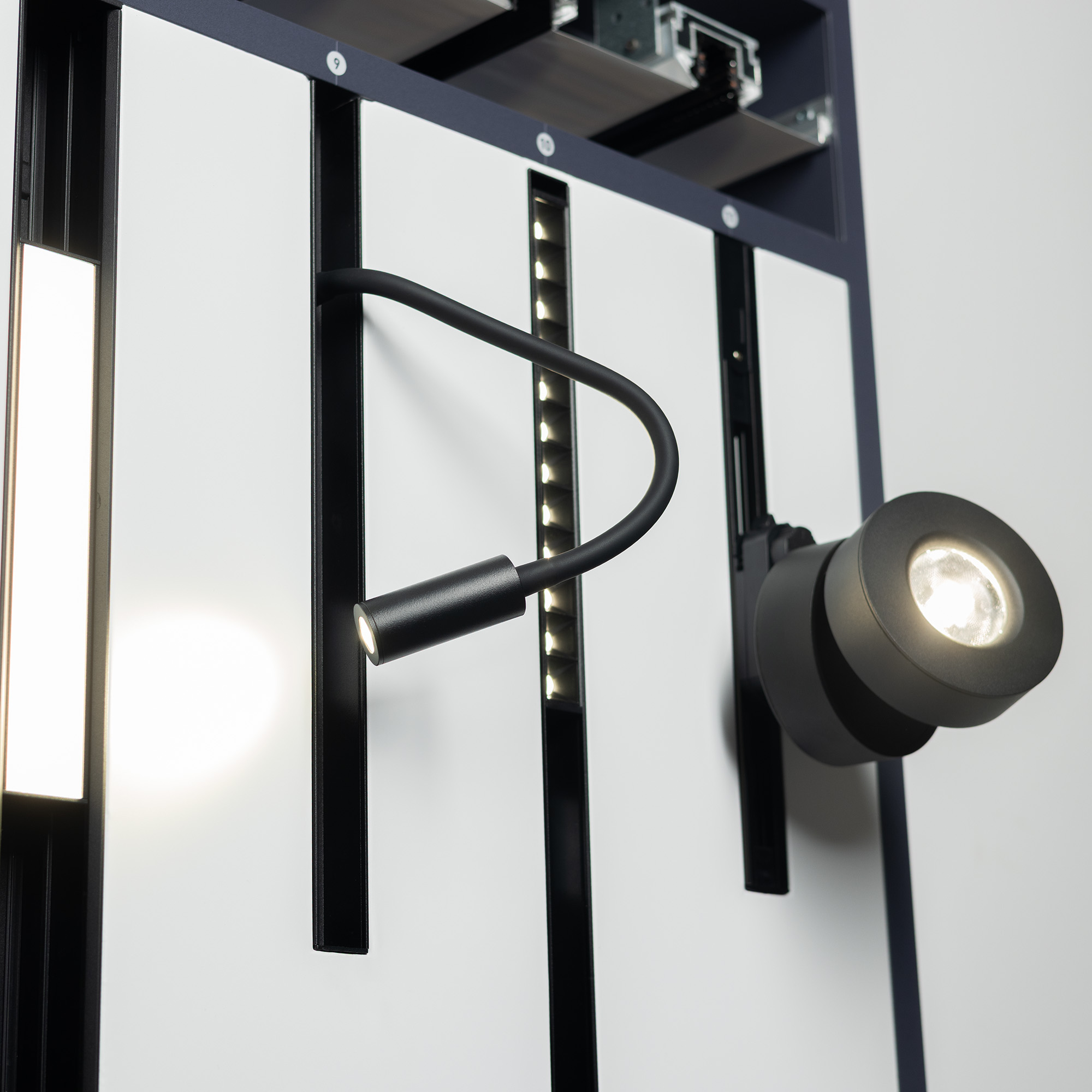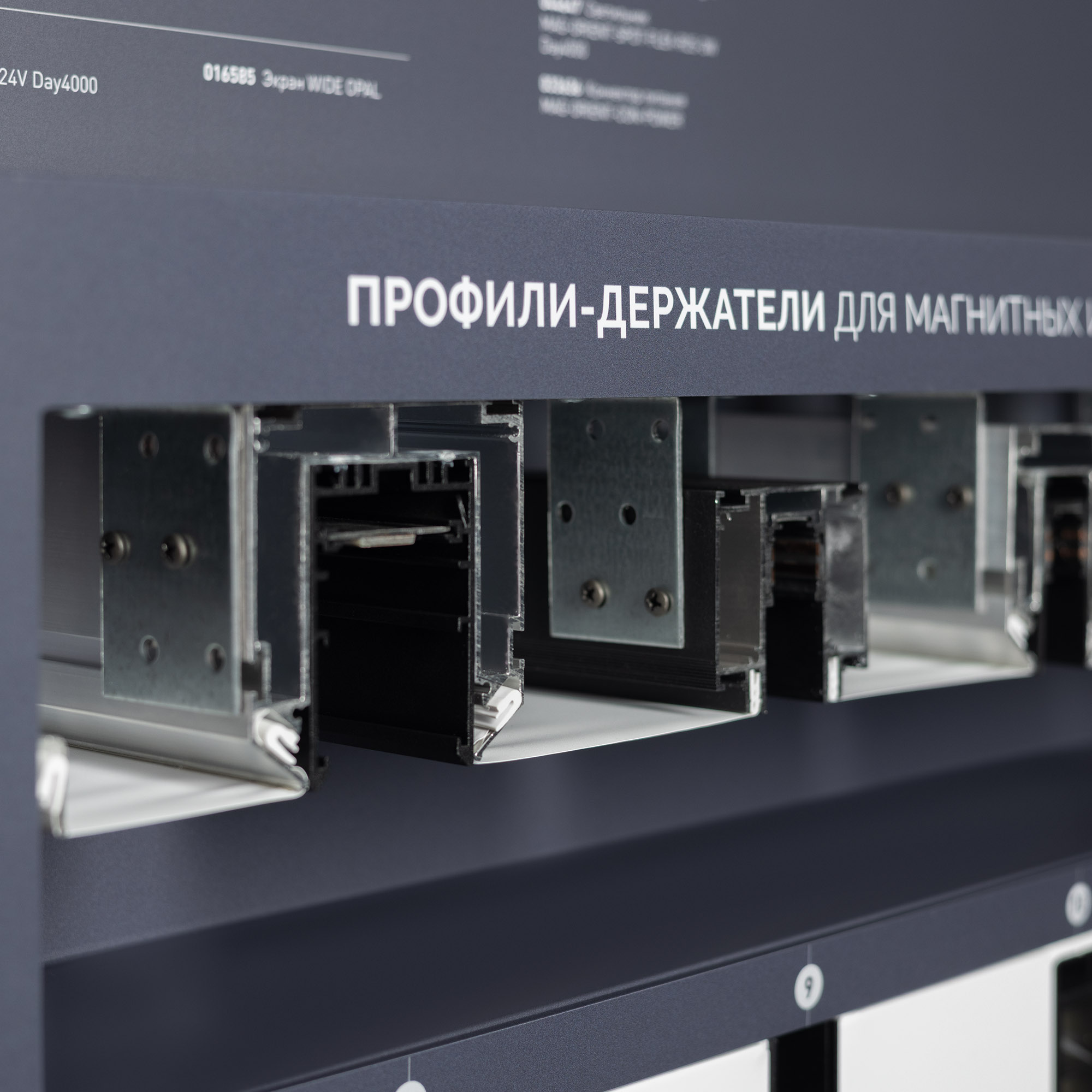 На стенде представлен ассортимент профилей Arlight для натяжных потолков: Профиль серии FOLED совмещающает в своей конструкции каркас для крепления натяжного потолка из ПВХ, гипсокартона и профиль для установки светодиодной ленты. Серия STRETCH с шириной световой линии 22 мм подходит для создания центральной и боковой линии света в натяжных потолках из ткани и ПВХ. Профиль-держатель MAG STRETCH для установки магнитных треков в натяжной потолок.