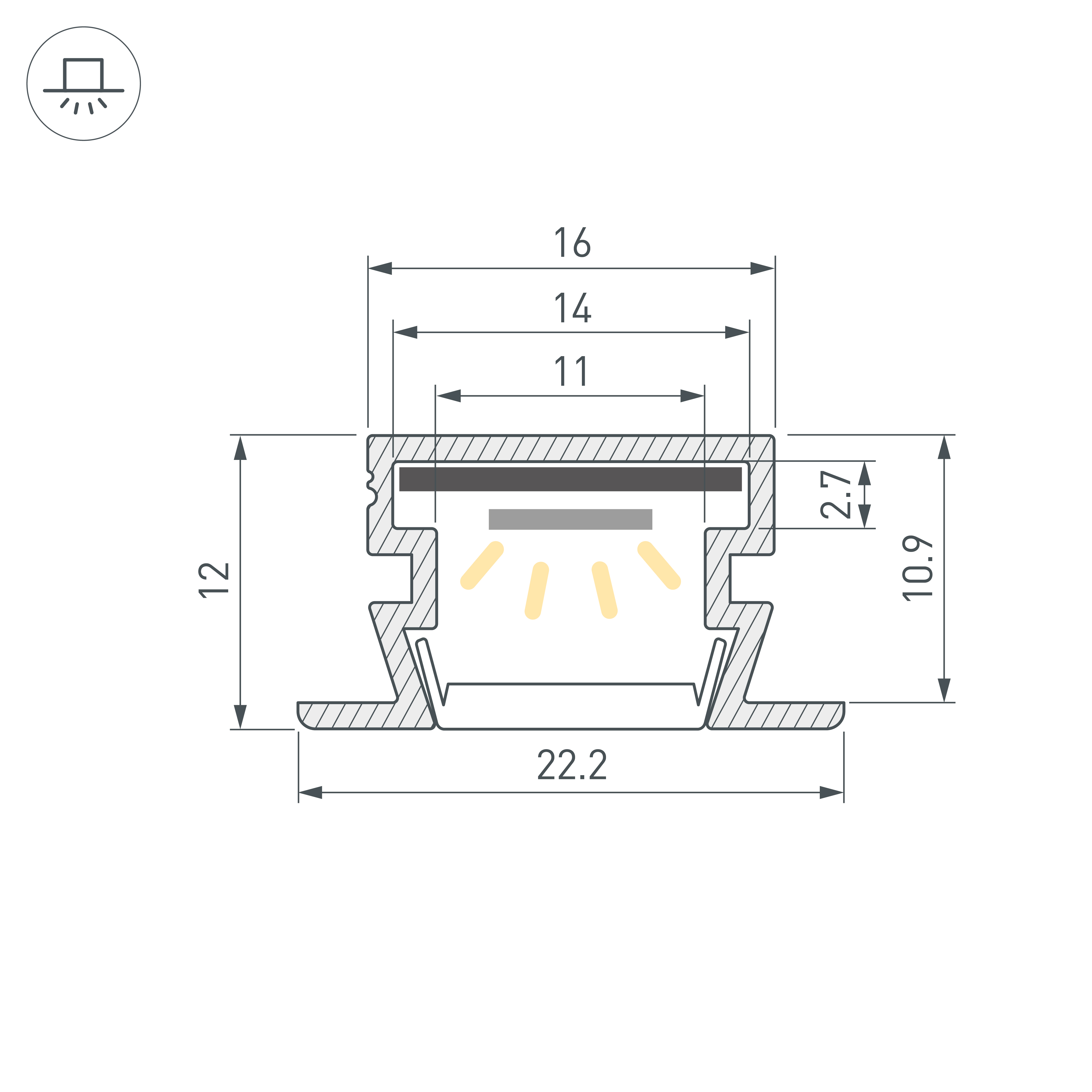 Габаритные размеры профиля составляют 2000 мм в длину, 22,2 мм в ширину и 12 мм в высоту. Площадка для установки светодиодных лент позволяет использовать ленту шириной до 14 мм и мощностью до 16,4 Вт/м. Это обеспечивает гибкость в выборе светодиодных лент и создает потрясающие световые решения.