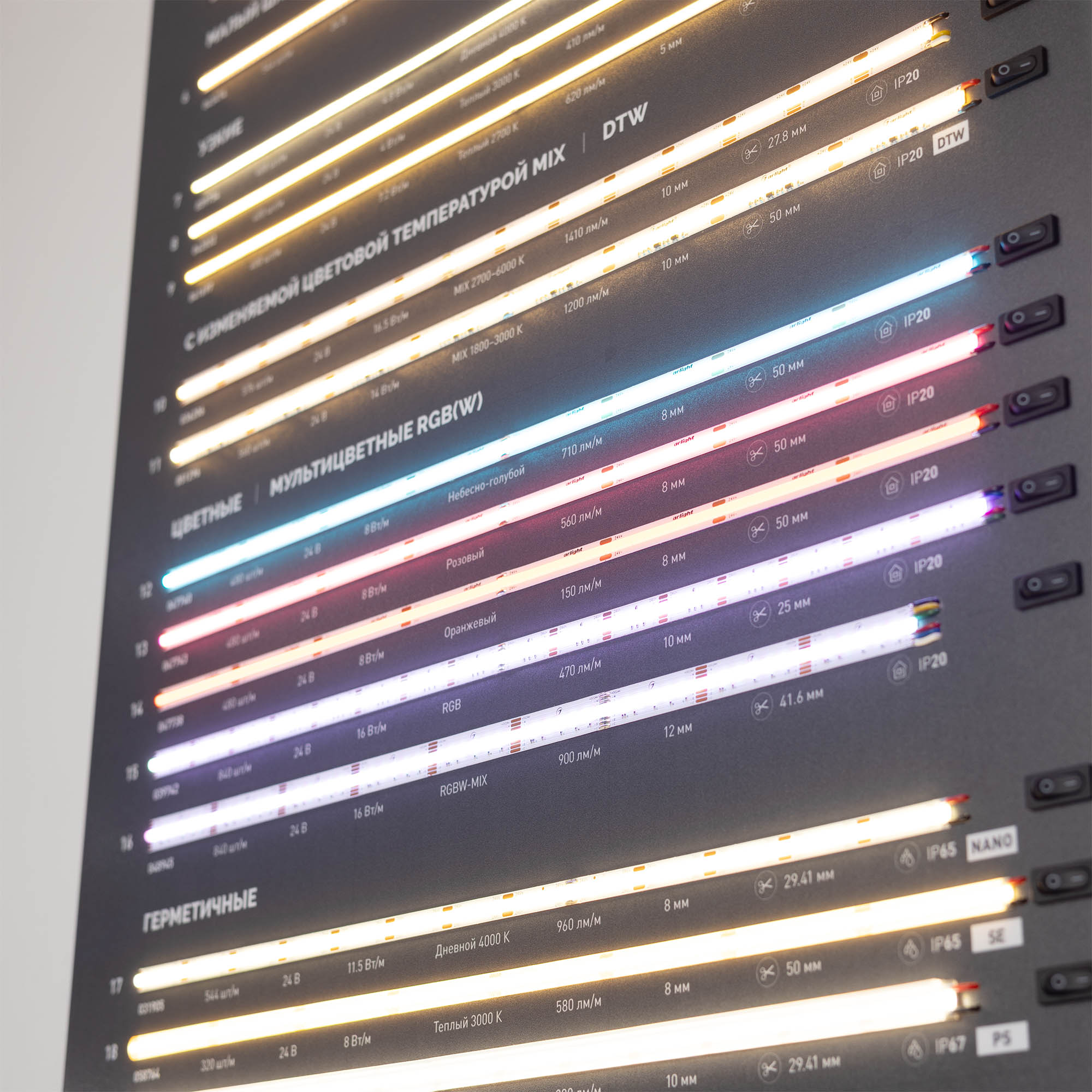 На стенде представлены ленты для создания основного и декоративного освещения: с высокой плотностью светодиодов, СОВ (без видимых светодиодов), ленты бокового свечения.