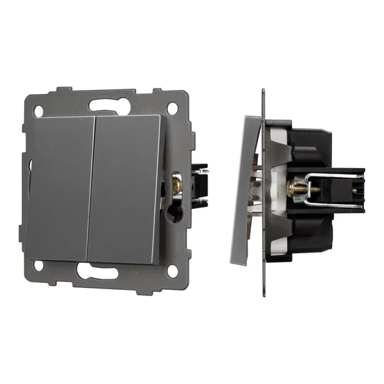 Механизм выключателя света клавишный на 1 пост 2 клавиши (непроходной). Цвет - серый. Без фронтальной рамки. Уровень пылевлагозащиты IP20. Выключатель устанавливается в стандартный круглый подрозетник.