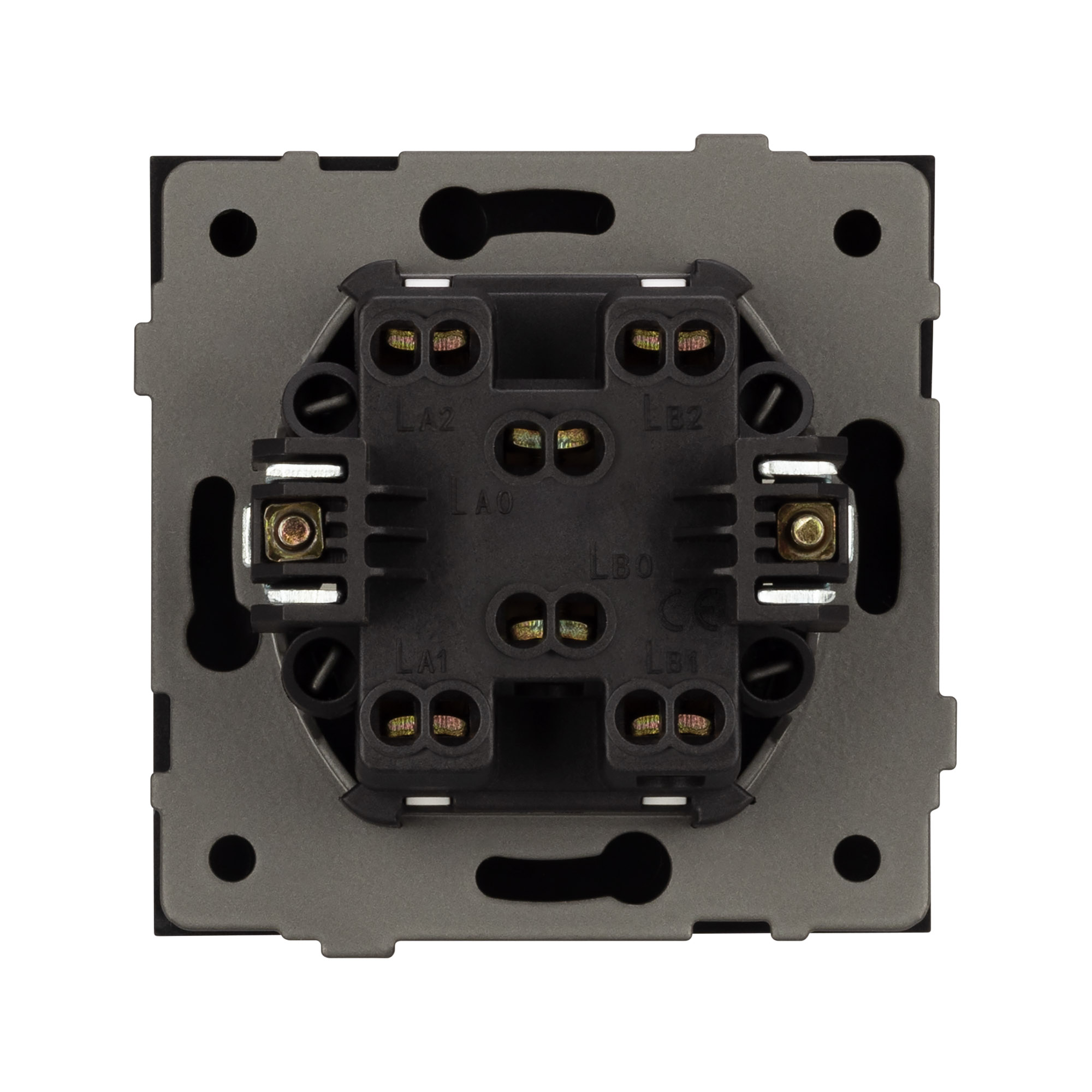 Механизм выключателя света клавишный на 1 пост 1 клавиша (перекрестный). Цвет - черный. Без фронтальной рамки. Уровень пылевлагозащиты IP20. Выключатель устанавливается в стандартный подрозетник круглого сечения диаметром 60мм.