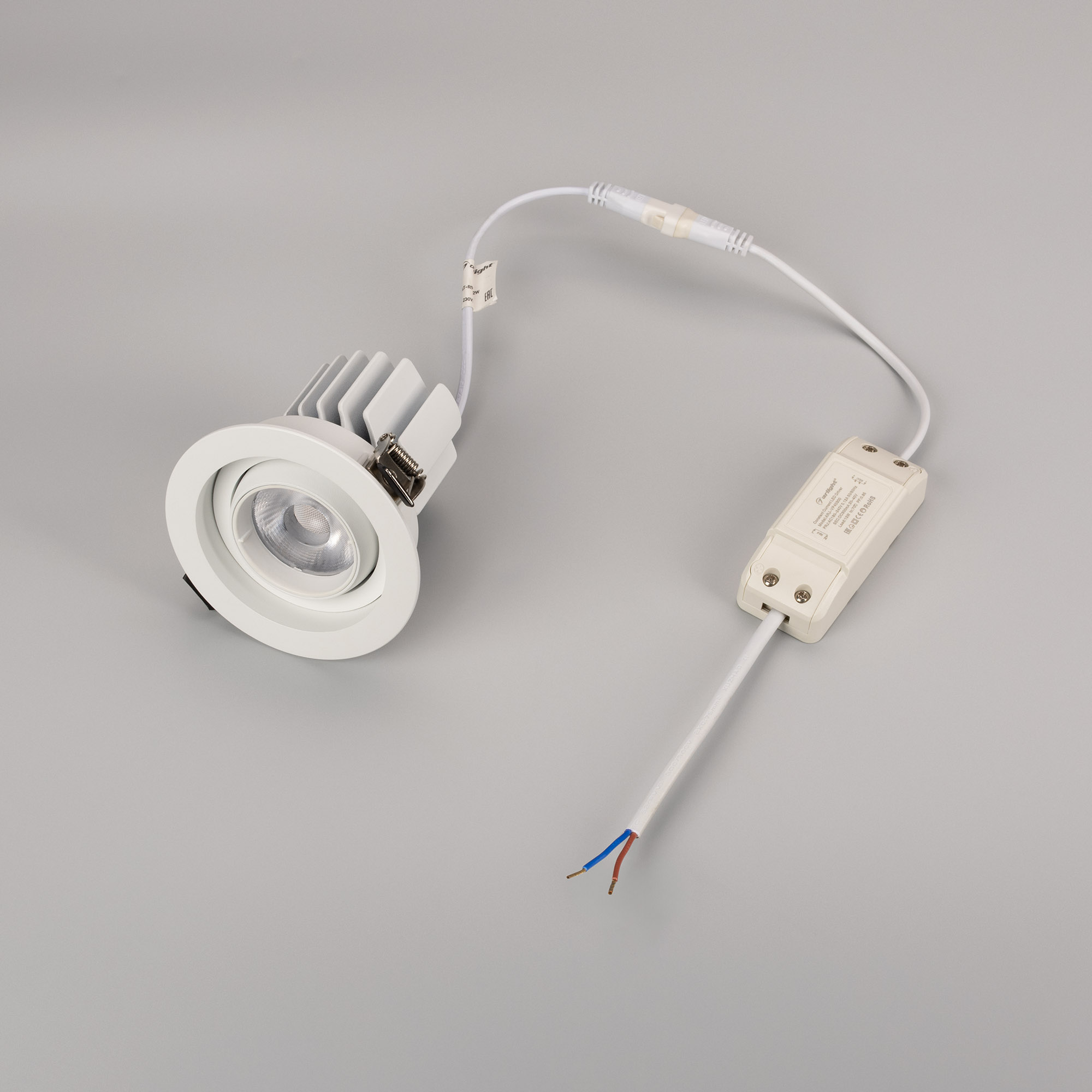 Встраиваемый карданный светильник. Мощность 12 Вт, св. поток 1394 лм, 116 лм/Вт, тёплый 4000 K, CRI>92, угол 40°, напряжение питания 230 В. Белый корпус из алюминия, белая вставка, степень защиты IP20. Размер: диаметр 90 мм, высота 80 мм. Монтаж встраиваемый, установочное отверстие: диаметр 75мм. Драйвер 27-40 В, 300 мА, пульсация <2%.