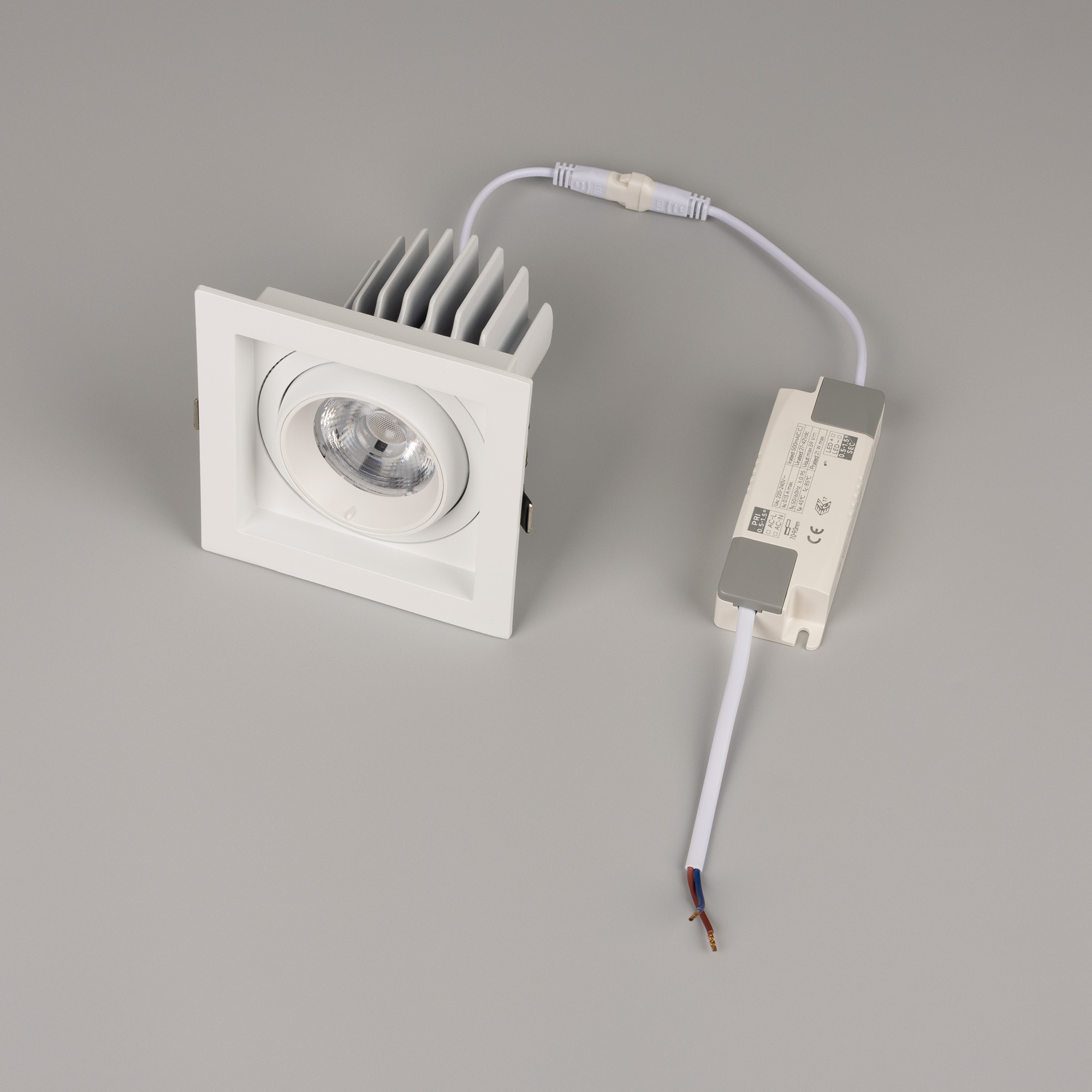 Встраиваемый карданный светильник. Мощность 20 Вт, св. поток 2132 лм, 107 лм/Вт, тёплый 3000 K, CRI>92, угол 40°, напряжение питания 230 В. Белый корпус из алюминия, белая вставка, степень защиты IP20. Размер: длина 117 мм, ширина 117 мм, высота 105 мм. Монтаж встраиваемый, установочное отверстие: длина 95 мм, ширина 95 мм. Драйвер 24-42 В, 500 мА, пульсация <2%.