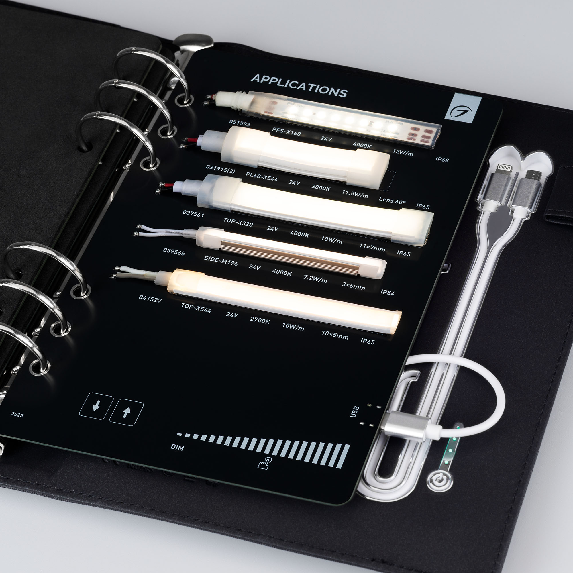 Демонстрационный набор светодиодных лент ARLIGHT. В кейс входят 17 образцов моделей лент COB, RTW, MICROLED, MIX, RGB, (RGBW, RGB-White MIX), NEON (MOONLIGHT). Демо-кейс работает от Power Bank (8000 mAh). в комплекте 3 разъема для подключения и 1 разъем для зарядки.