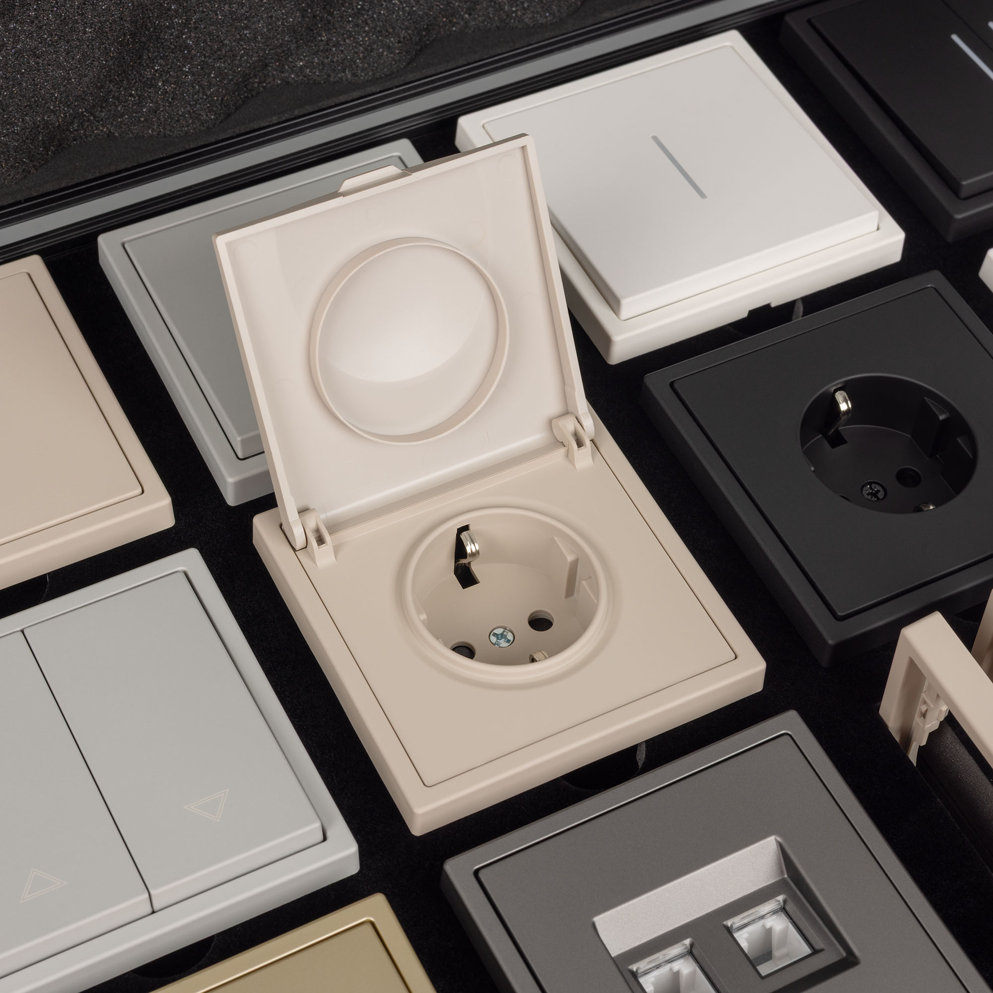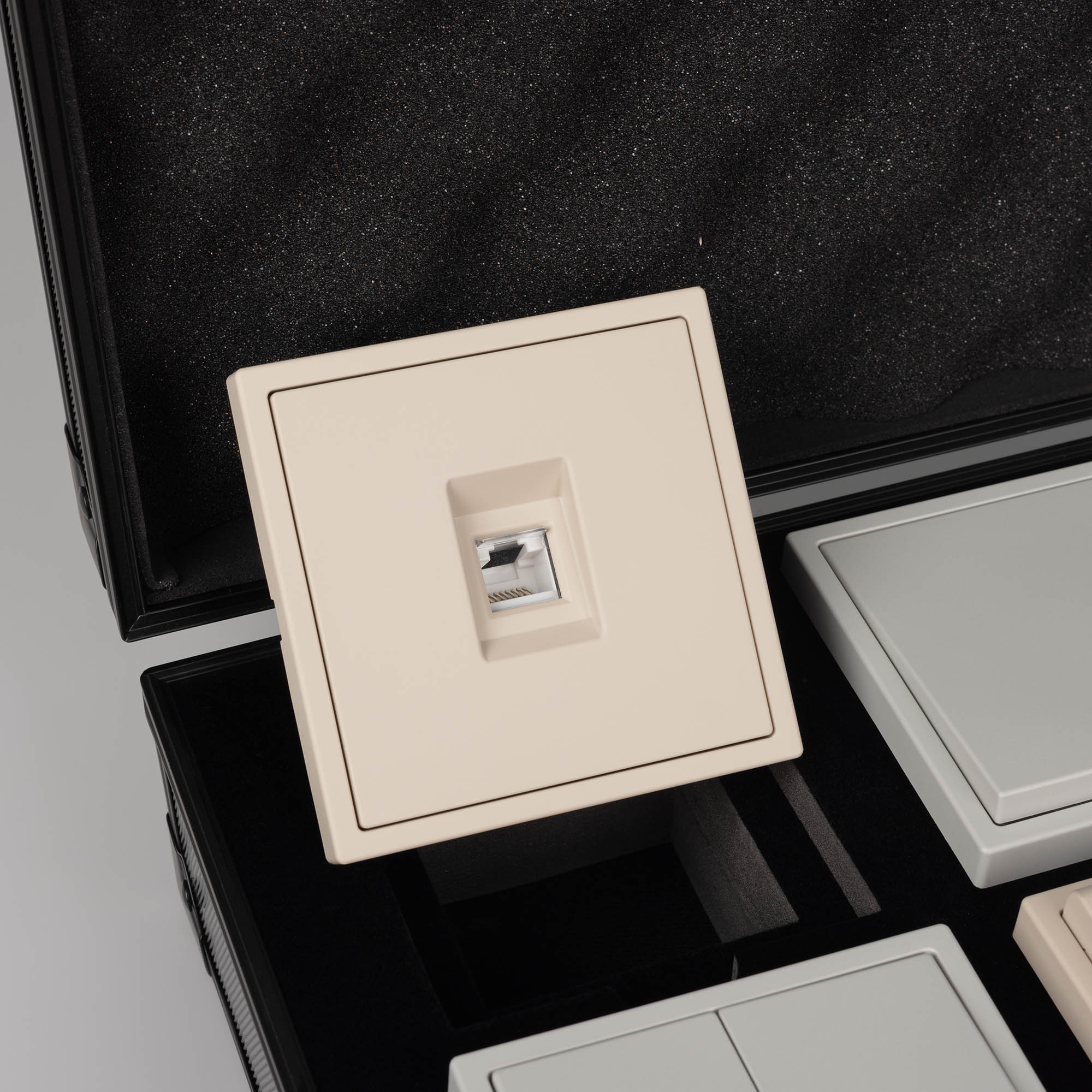 Демо-кейс с серией NOBE. Демо-кейс содержит: Рамки серии NOBE в цветах Белый кварц, Черный оникс, Золотой песок и Серый базальт. Поверхность рамок имеет Soft-Touch покрытие: арт.054212 - 3шт арт.054213 - 3шт арт.054214 - 3шт арт.054211 - 3шт арт.059454 - 3шт арт.059455 - 3шт Механизм сдвоенной розетки под выходы RJ45 для интернет кабеля в цвете Серый базальт - арт.054315 Механизм розетки с дополнительными USB Type A + Type С выходами в цвете Белый кварц - арт.054284 Механизм выключателя на две клавиши (непроходной) в цвете Золотой песок - арт.054253. Механизм выключателя на две клавиши с подсветкой LED (непроходной) в цвете Черный оникс - арт.054264. Механизм розетки под евровилку в цвете Черный оникс - арт.054277 Механизм розетки влагозащищенный в цвете Золотой песок - арт.054282 Механизм выключателя на одну клавишу с подсветкой LED (непроходной) в цвете Белый кварц - арт.054232 Механизм выключателя управления шторами на две перекидные клавиши в цвете Серый базальт - арт.054275 Рамки представленной серии накладного типа монтажа - не требуют дополнительного оборудования для установки рамки на механизме.