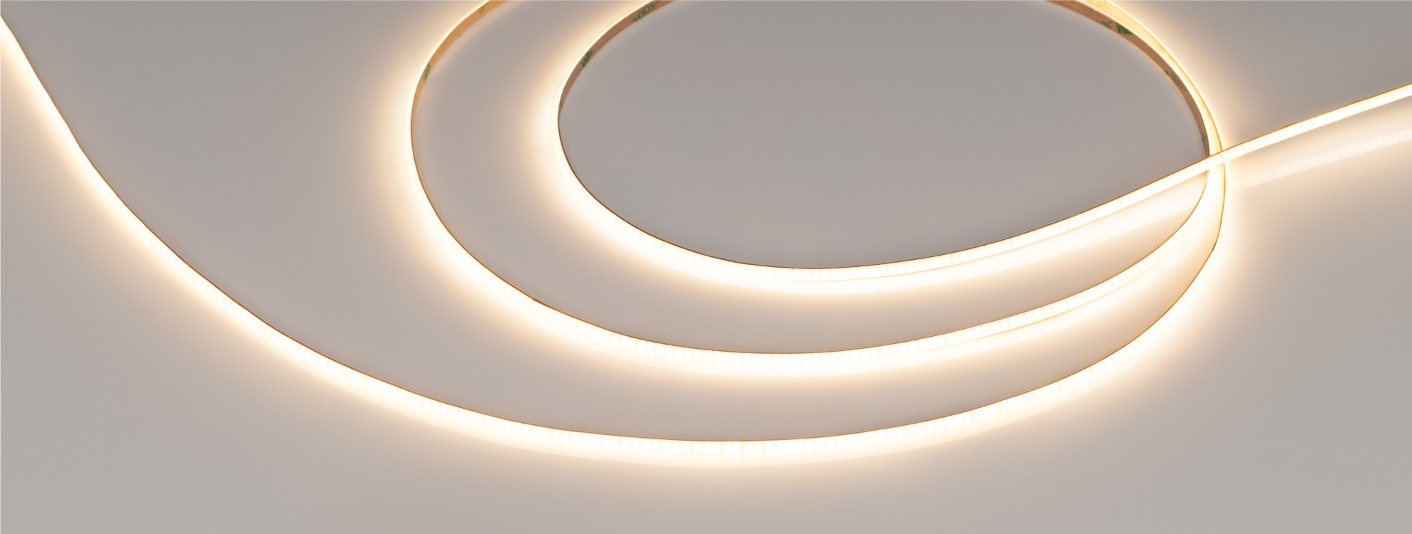 Основное преимущество бескорпусных лент COB — эффект сплошной линии света без применения рассеивателей (экранов). За счет заливки люминофором по всей длине ленты образуется равномерное свечение без видимых точек светодиодов. COB-ленты серии Х420 предназначены для декоративной подсветки интерьера, а также оформления рекламы и витрин. Тип светодиодов — CSP (X).