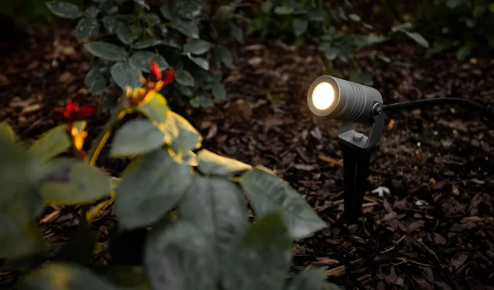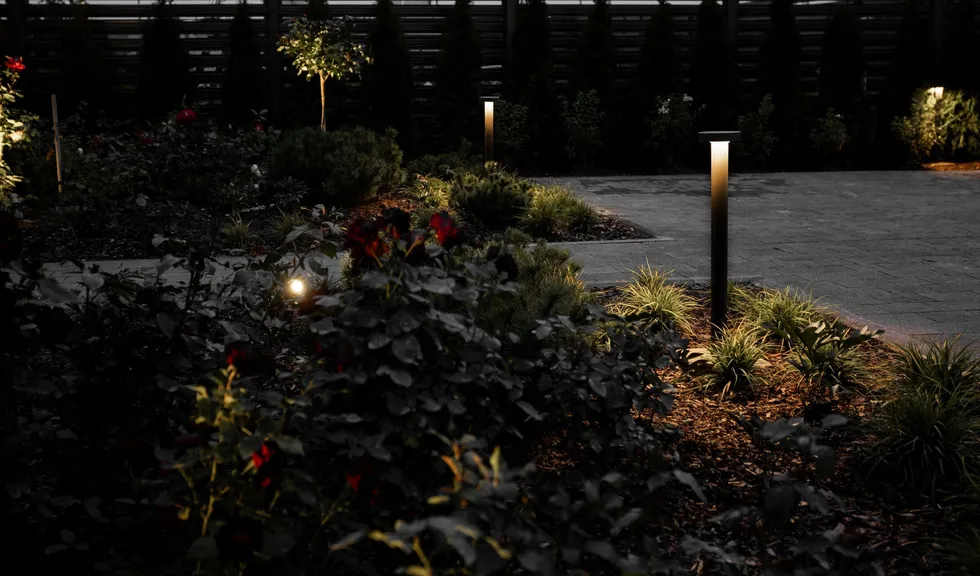 Акцентный слой, выполненный светильниками серии RAY, подчеркивает красоту кустарников и розария.