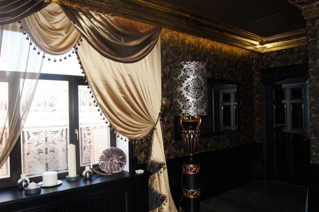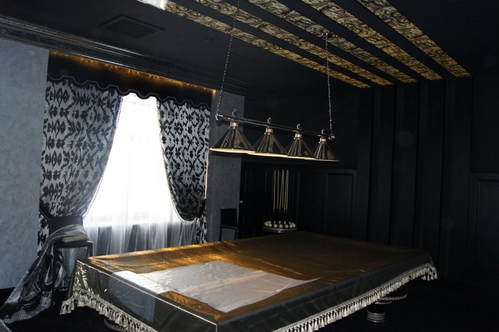Равномерная подсветка колонн, закарнизная подсветка, подсветка штор гармонично сочетаются с интерьером всего клуба.