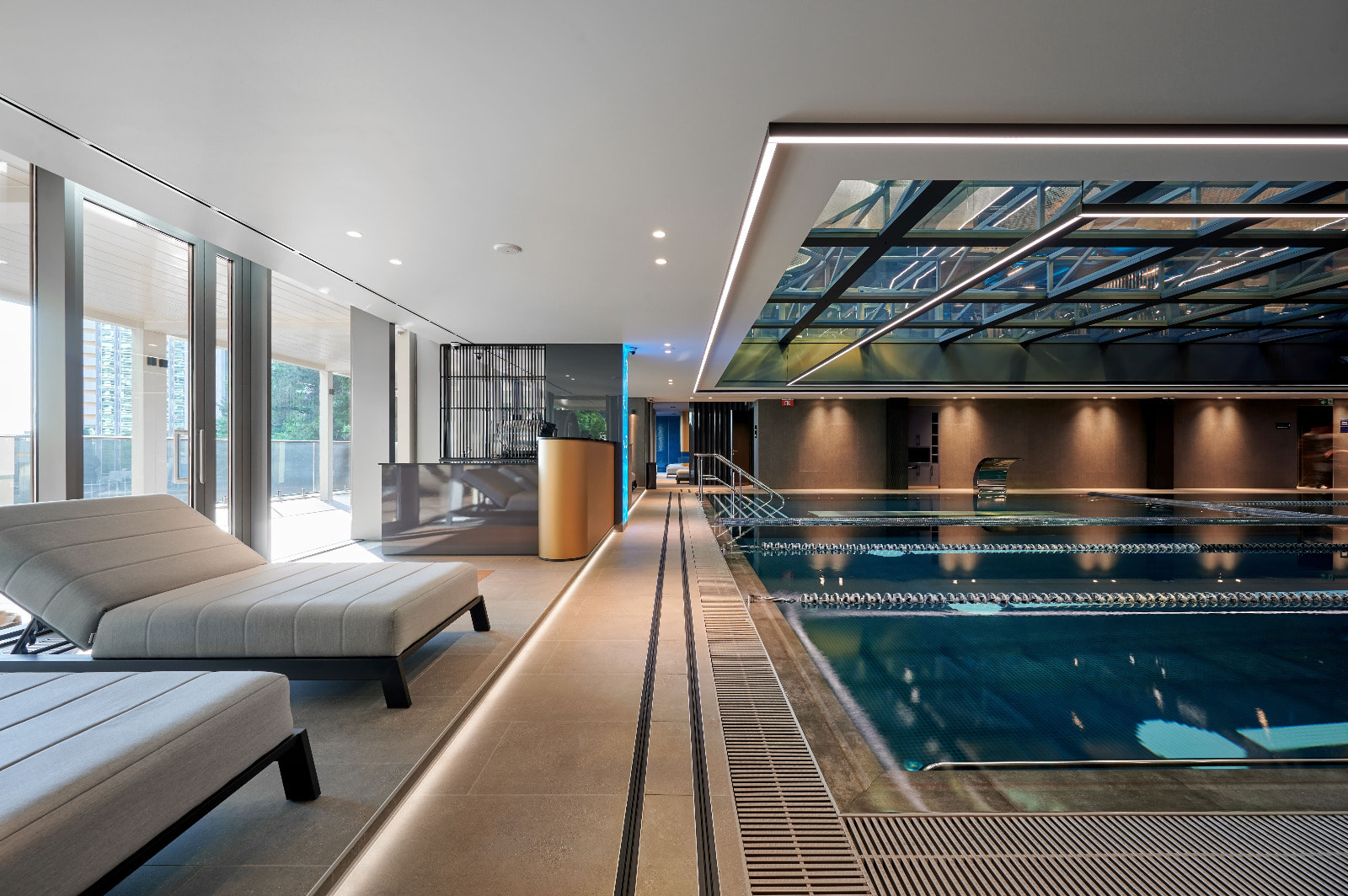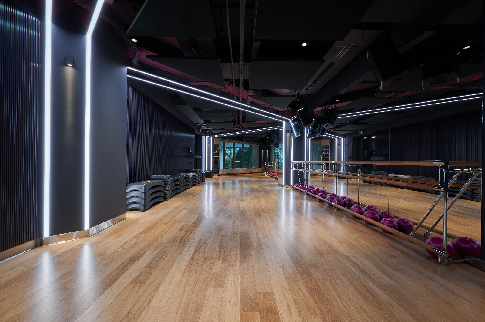 Фитнес-центр премиум-класса Encore Fitness состоит из нескольких этажей и включает в себя бассейн, термальные SPA-зоны, тренажерные залы, а также зал для занятий боевыми искусствами. Индивидуально для каждой зоны было разработано освещение с учетом всех нюансов проводимых в них активностей.