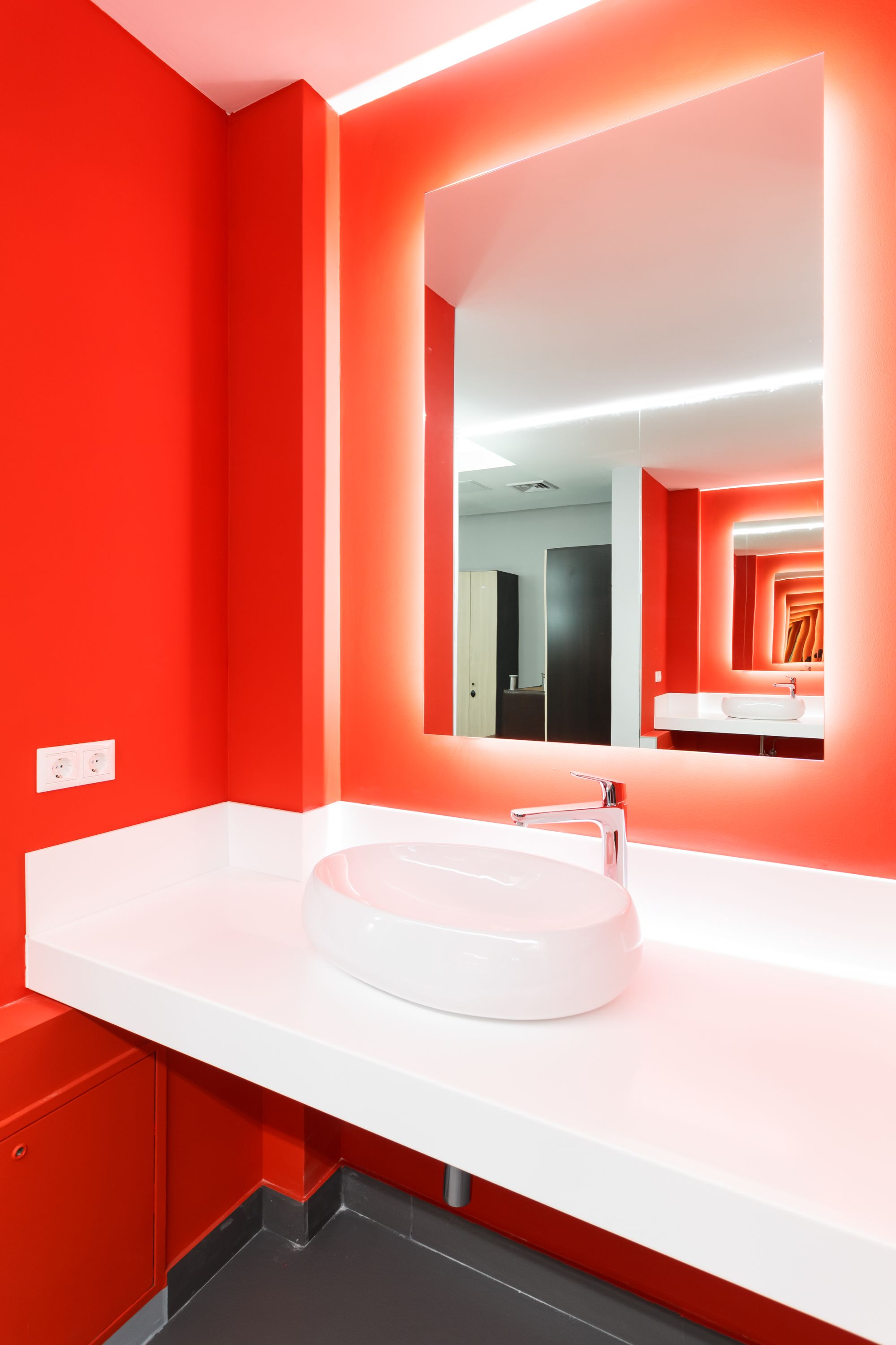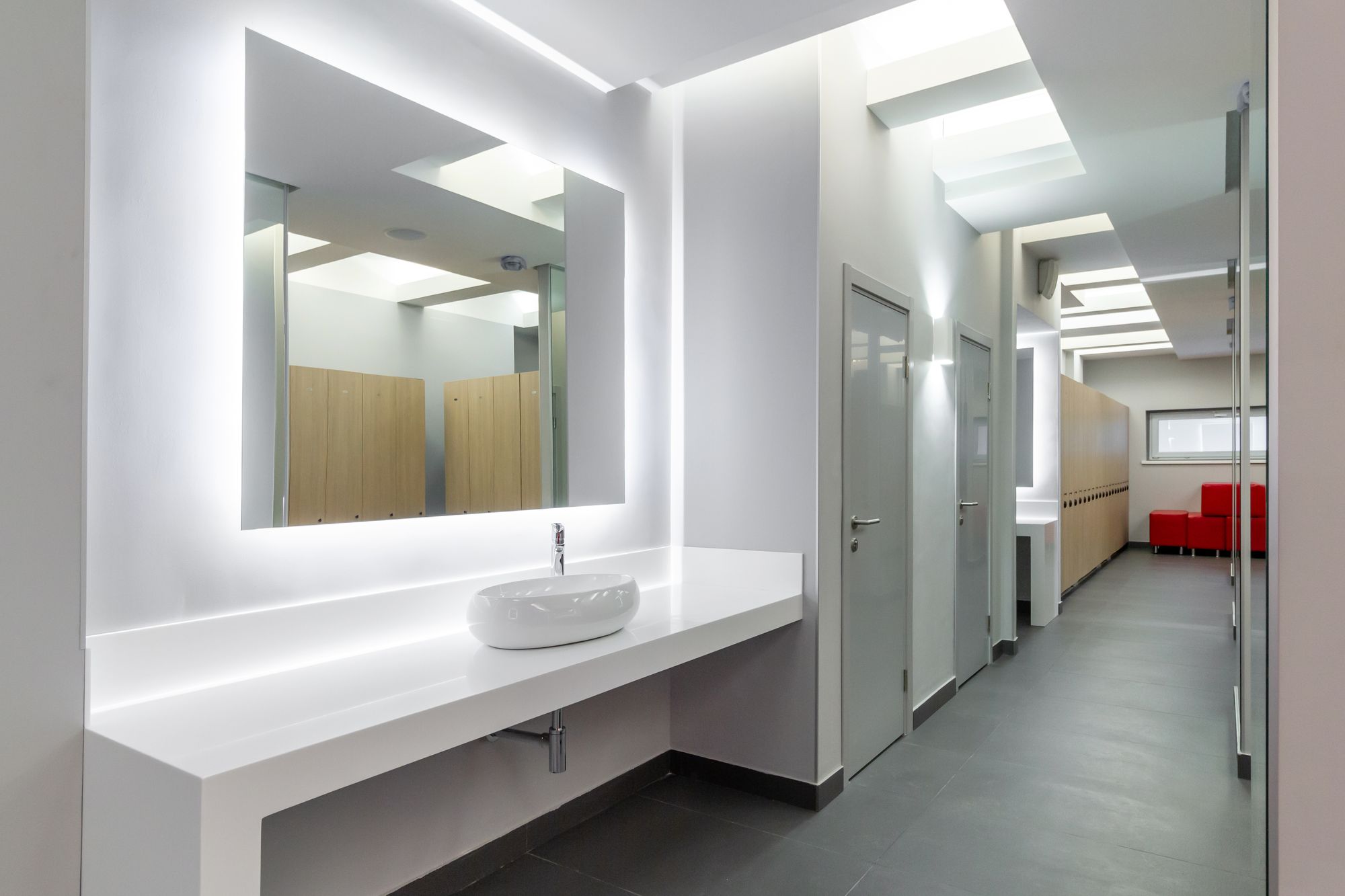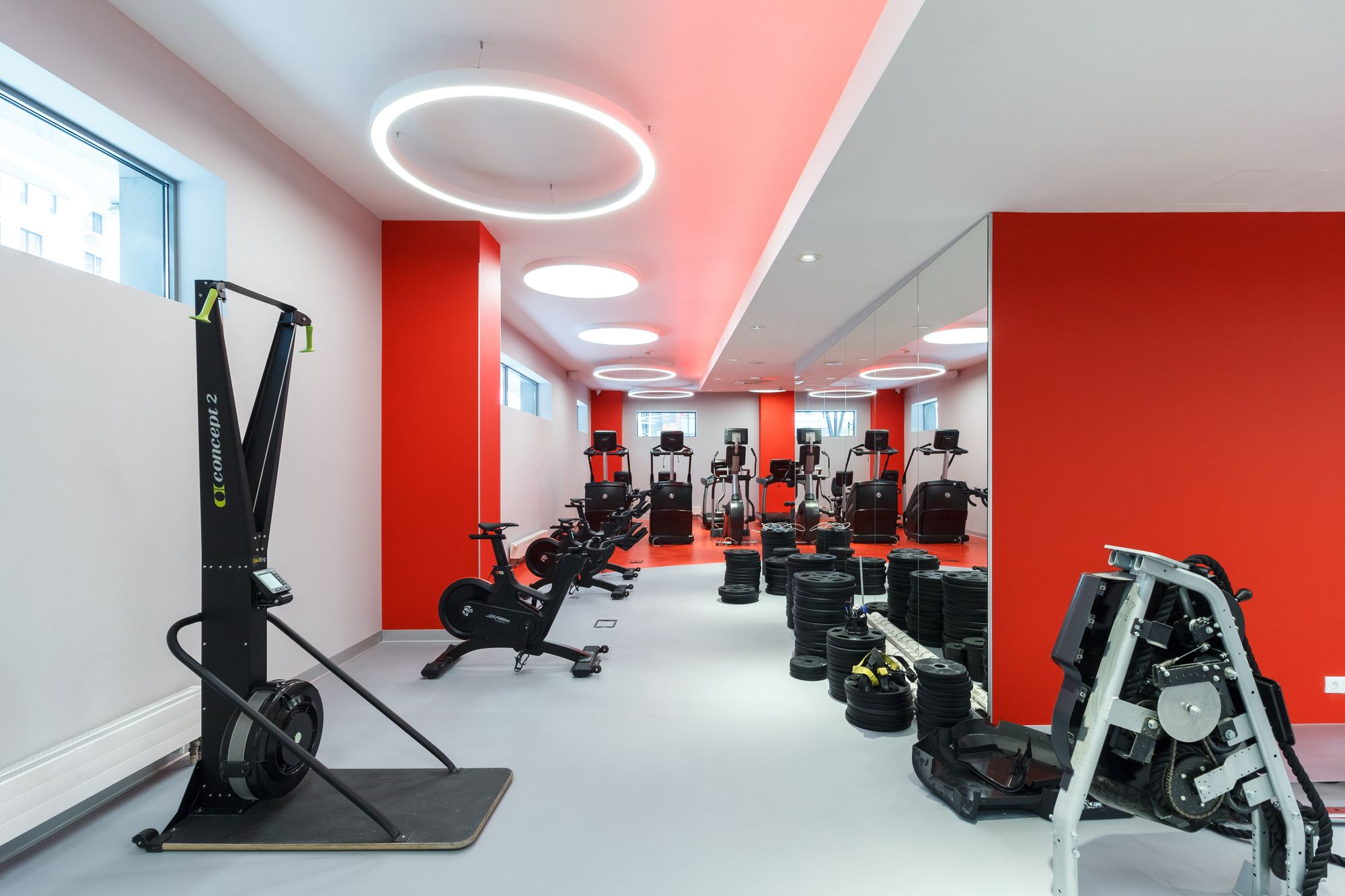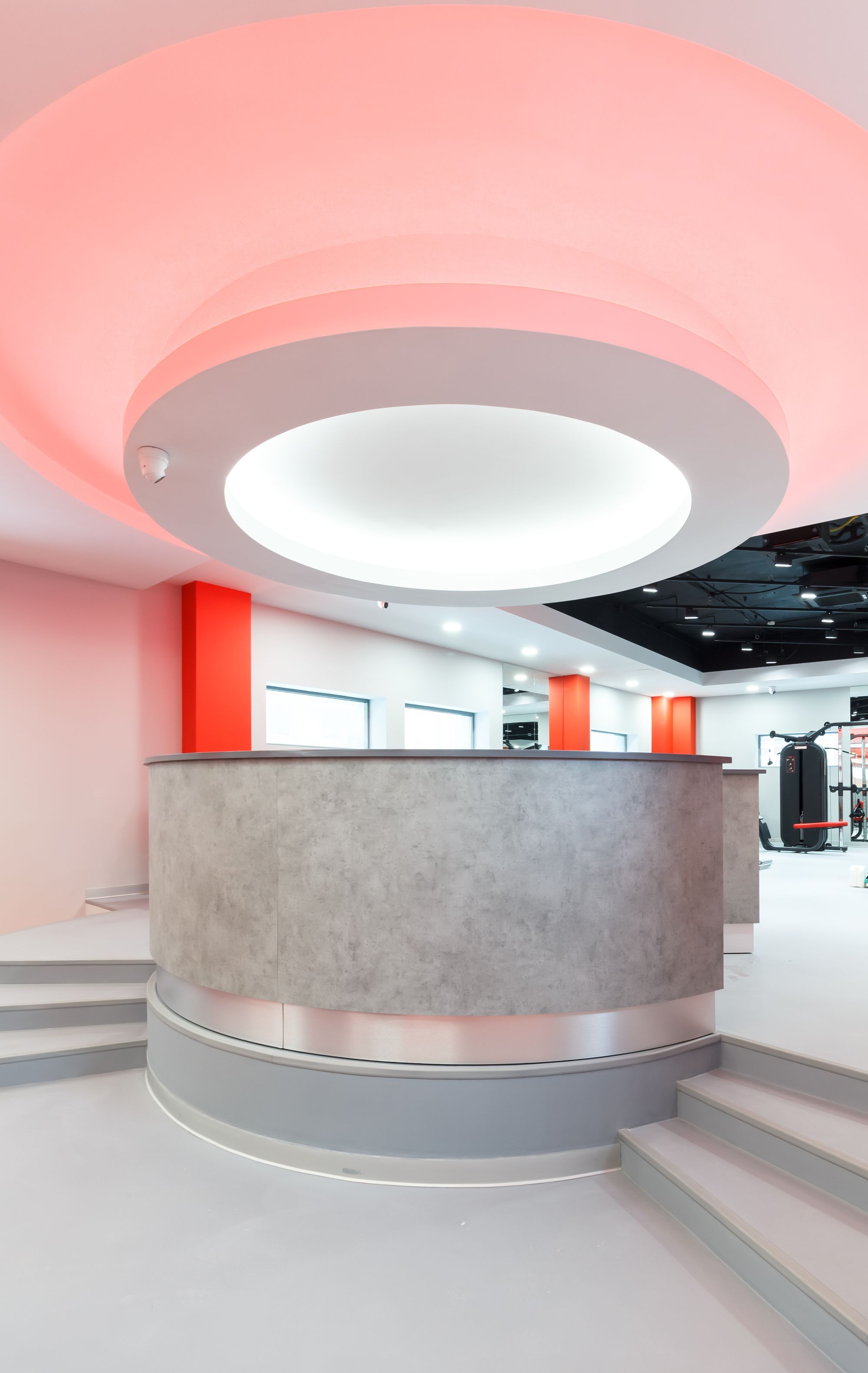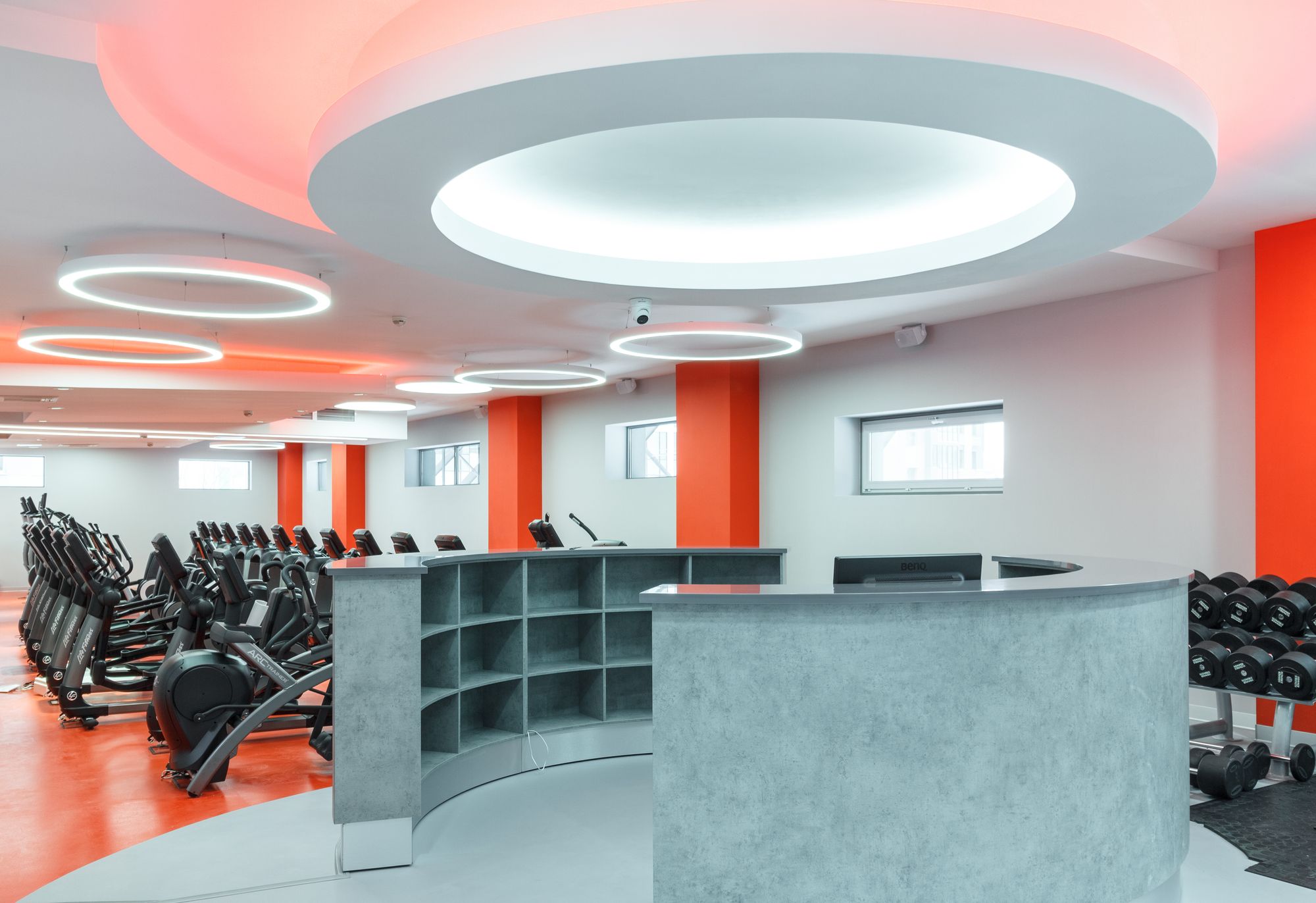 Основное освещение тренажерного зала выполнено с использованием круглых световых конструкций под потолком. Потолочные светильники выглядят как уточненные дизайнерские объекты. В зоне ресепшен размещен большой потолочный светильник, напоминающий мансардное окно, сквозь которое в помещение проникает солнечный свет. Двухрядные ленты с увеличенным числом светодиодов позволяют сделать подсветку равномерной, без видимых точек светодиодов.