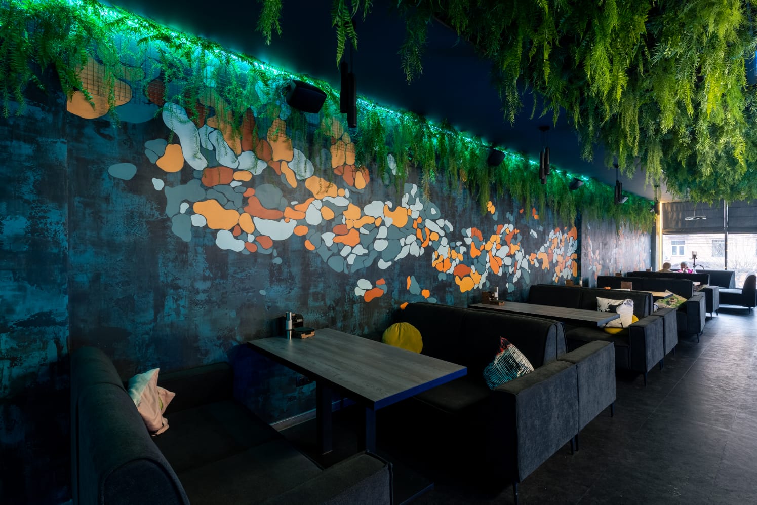 Висячие папоротники на потолке и вдоль стен разбавляют интерьер, привнося в него гармонию и освежающие природные мотивы.