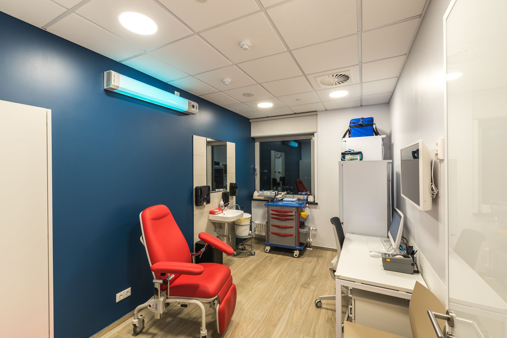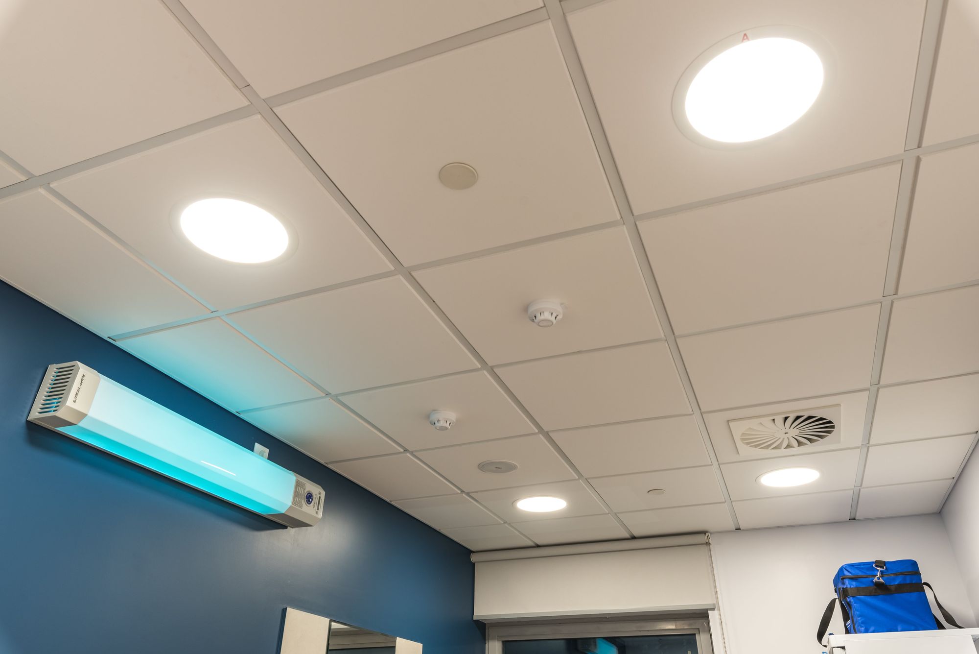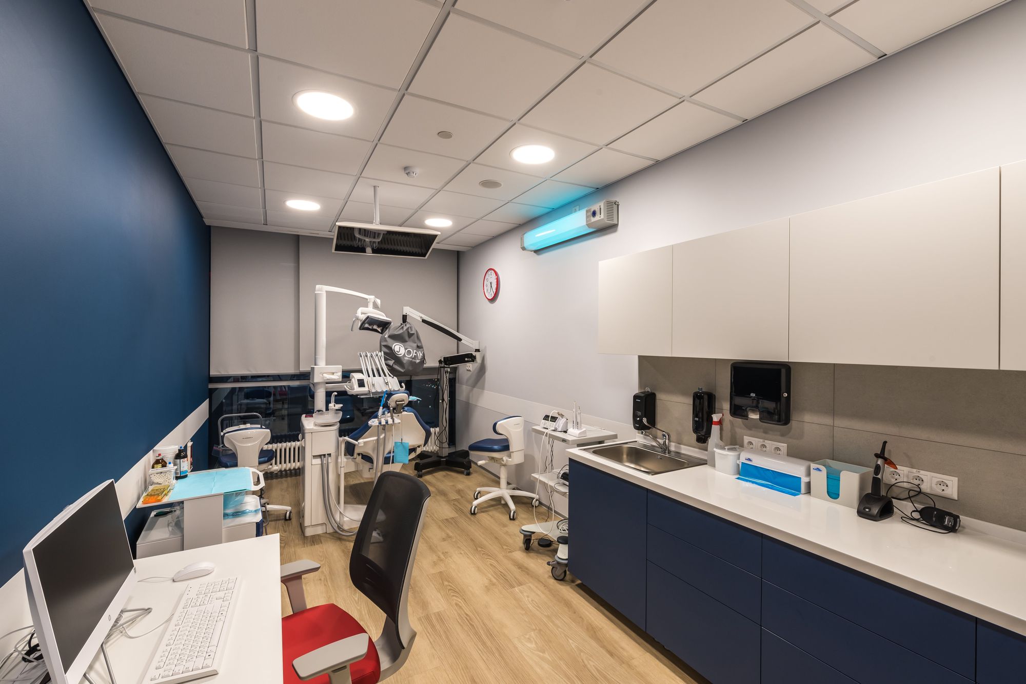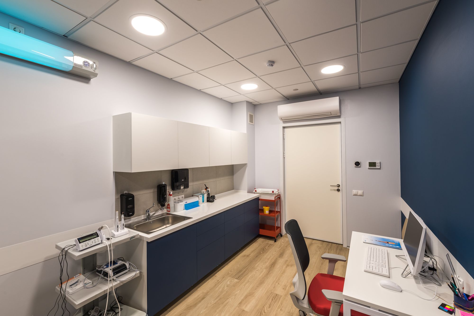 Изящные и тонкие светильники серии DL могут встраиваться в натяжные и гипсокартонные потолки небольшой толщины. В данном проекте светильники выполняют роль основного освещения в медицинских кабинетах, обеспечивают прекрасный рассеянный свет, комфортный для глаз. Блоки аварийного питания позволяют светильникам работать в дежурном режиме при внезапном отключении освещения.