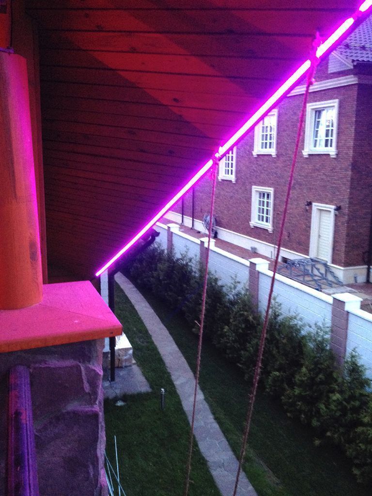 В данном проекте была реализована фасадная светодиодная подсветка коттеджа. Для этого светодиодная лента arlight® была установлена под крышу, вдоль её края. Так как подсветка установлена снаружи дома, высока вероятность того, что на неё может попасть дождь, снег или просто пыль, поэтому была применена герметичная светодиодная лента со степенью защиты IP67. Подсветка фасада коттеджа несёт в первую очередь декоративную функцию, поэтому была выбрана многоцветная RGB светодиодная лента. Цвет и яркость подсветки легко регулируются с сенсорного пульта ДУ, работающего в паре с RGB-контроллером arlight®.