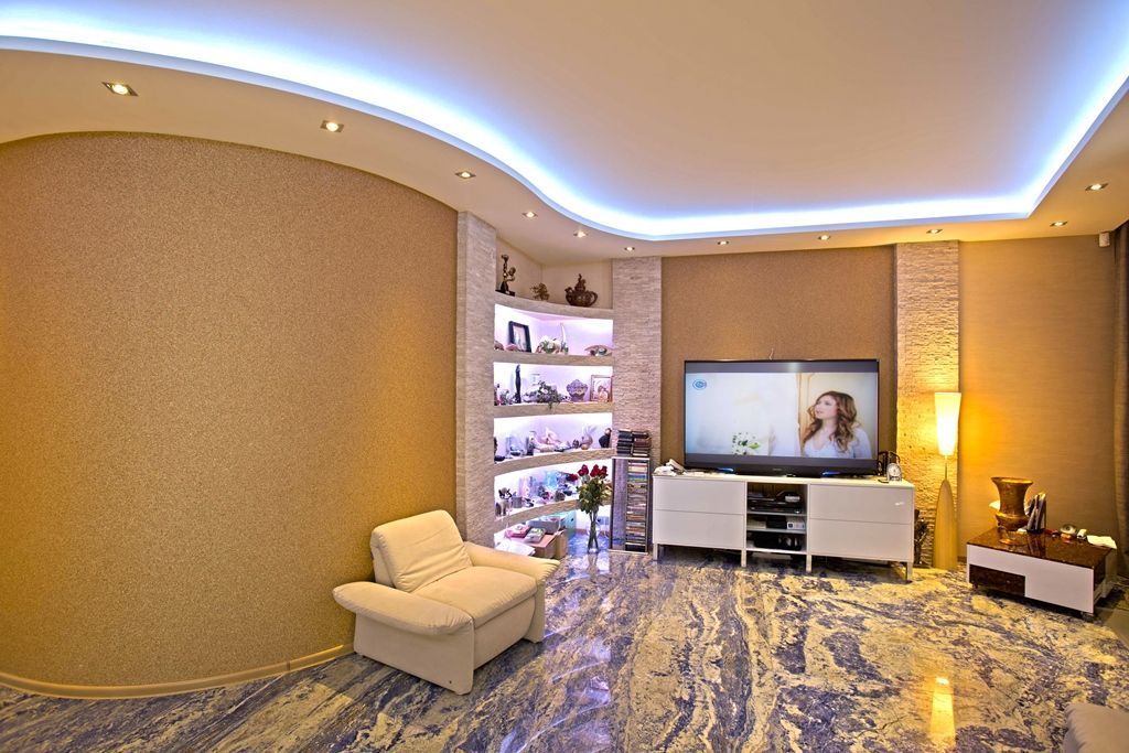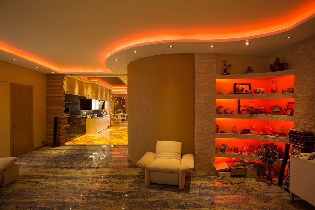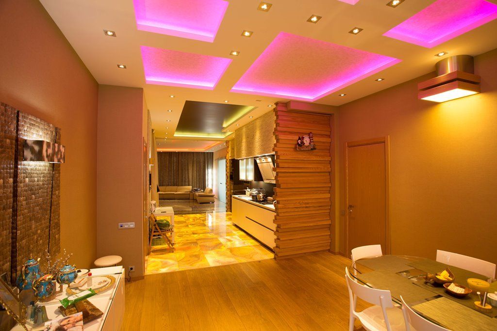Проект квартиры со светодиодной многоцветной подсветкой, установленной на многоуровневых потолках. Основной изюминкой данного интерьера стал пол из оникса со светодиодной подсветкой. Для реализации проекта использовалось светодиодное оборудование торговой марки arlight®.