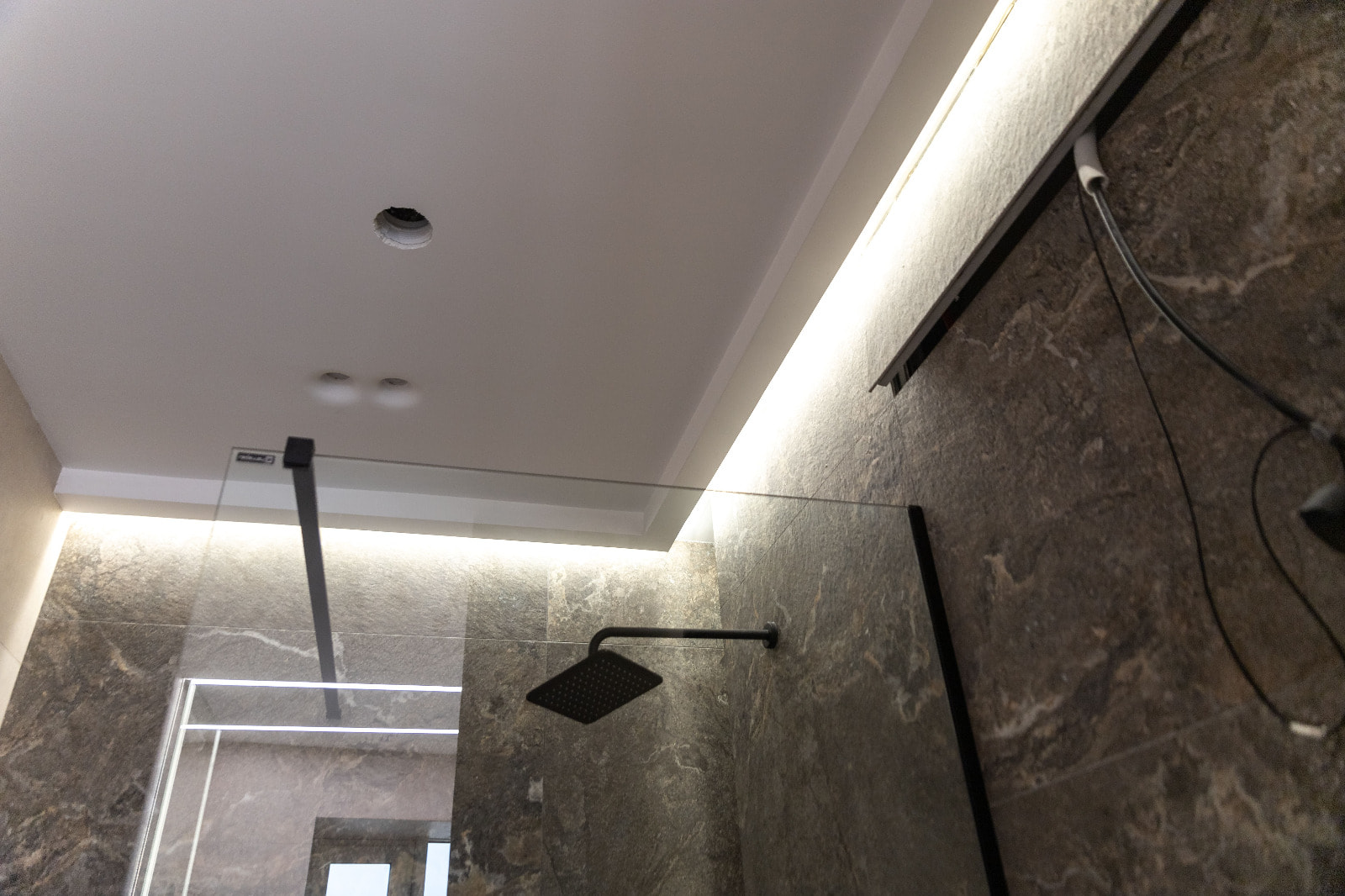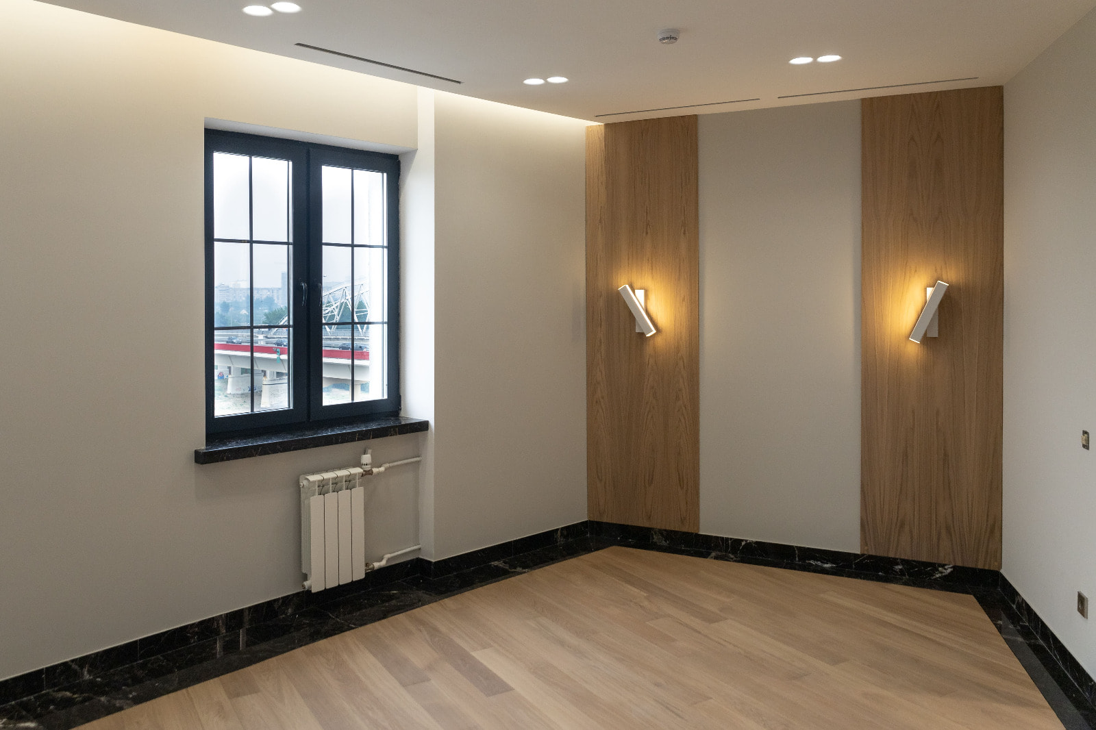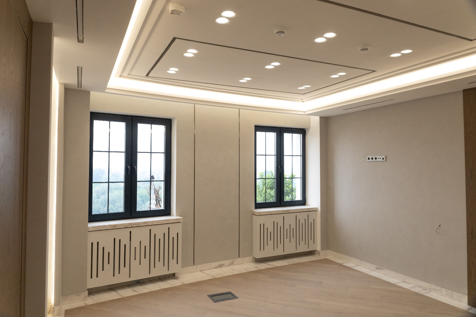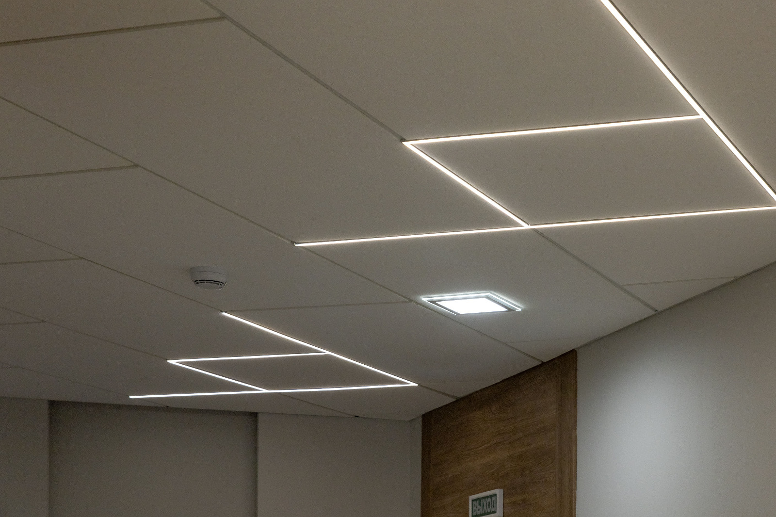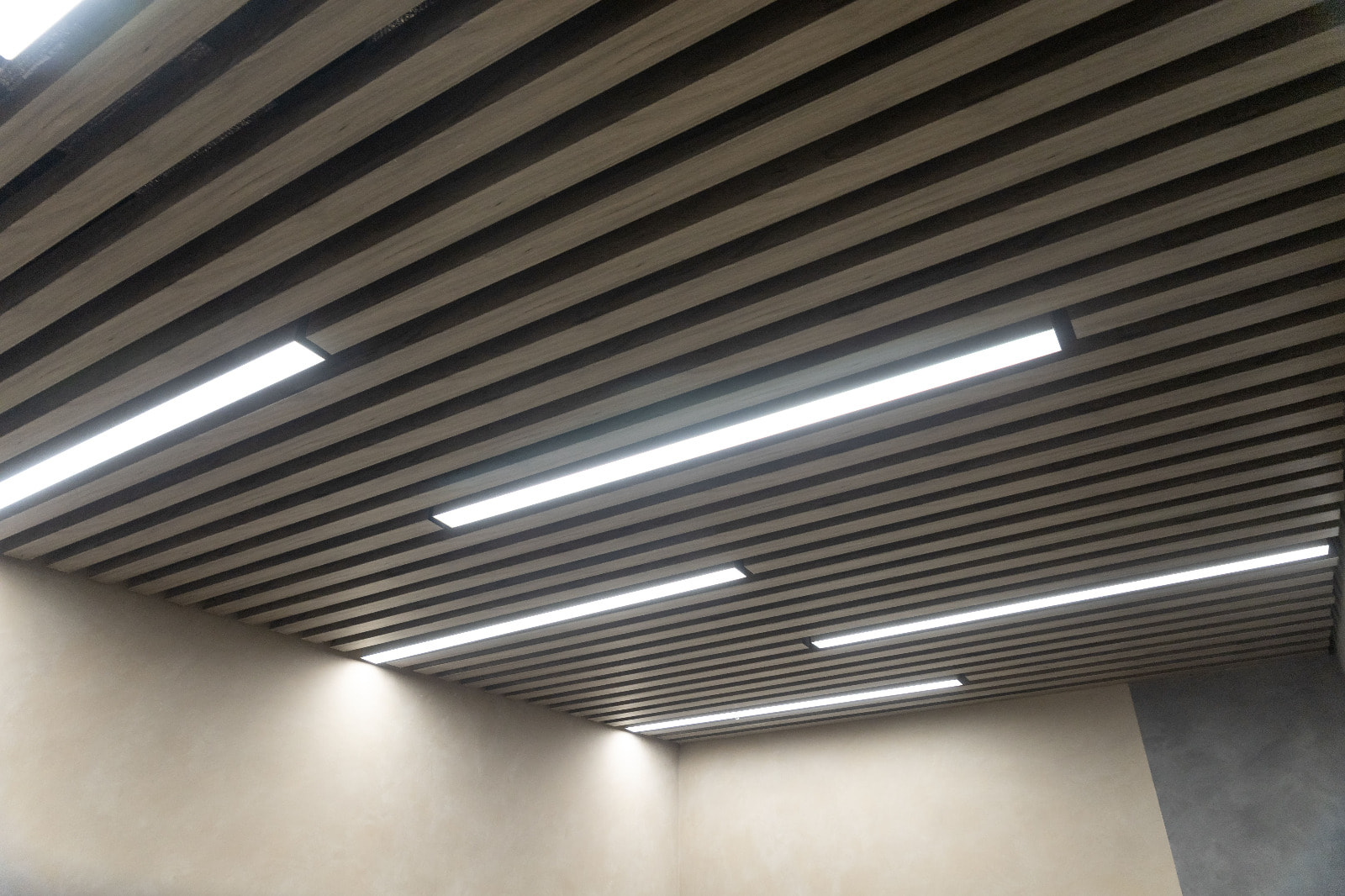 Для данного проекта под заказ были созданы светильники SP LINE на основе профиля разной формы и длины. Прямые линии отлично смотрятся между деревянных реек на потолке и в мраморных панелях, а крупная прямоугольная композиция подчеркивает геометрию комнаты.